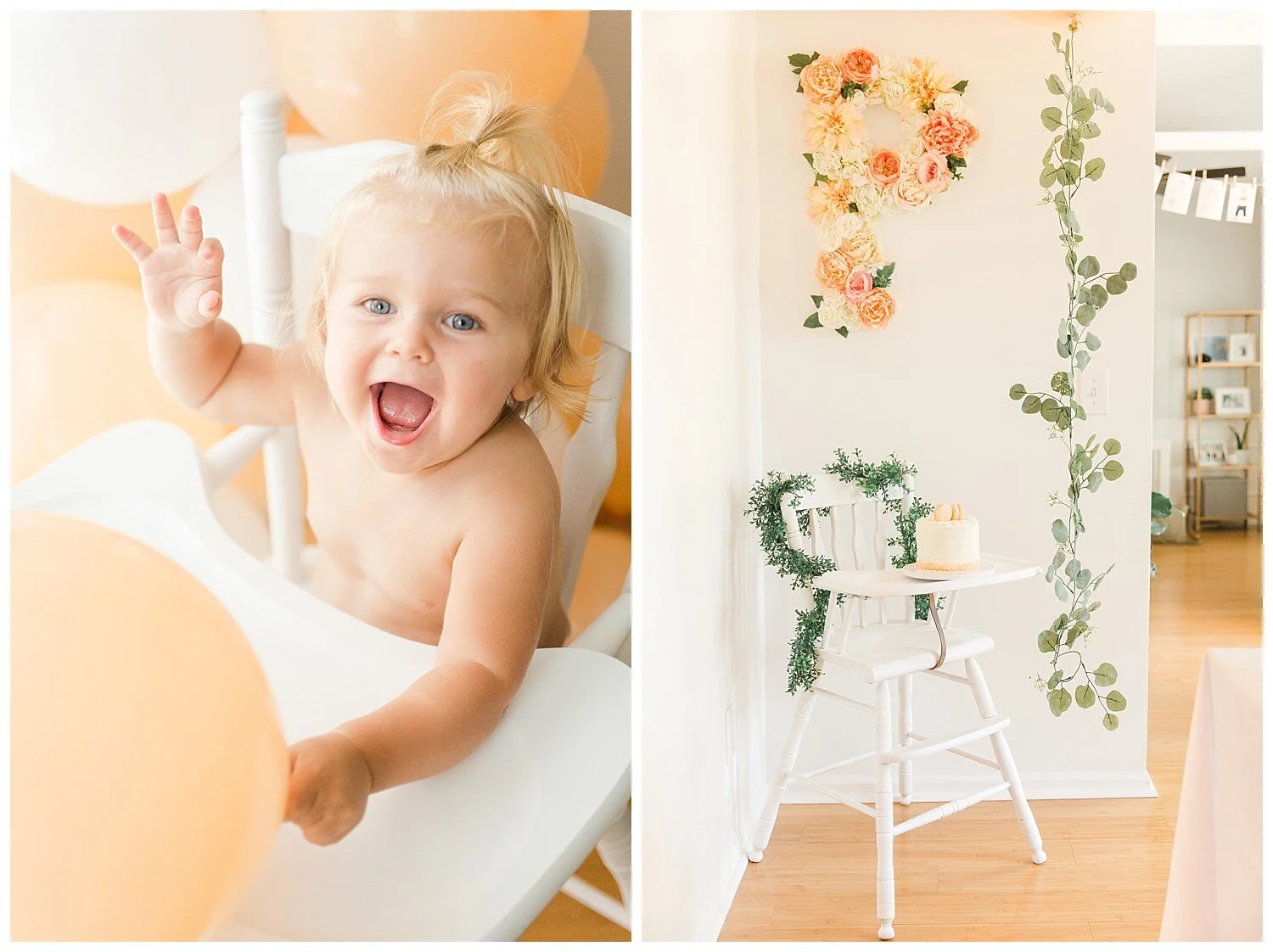 I found an adorable vintage highchair from a local antique shop and painted in white for the birthday girl. We strung a giant peach balloon to it and wrapped some greenery around the back to add a little extra detail. I created the giant letter “P” out of foam board and simply hot glued some silk flowers to it. It was such an easy little DIY detail that added a lot of visual impact!